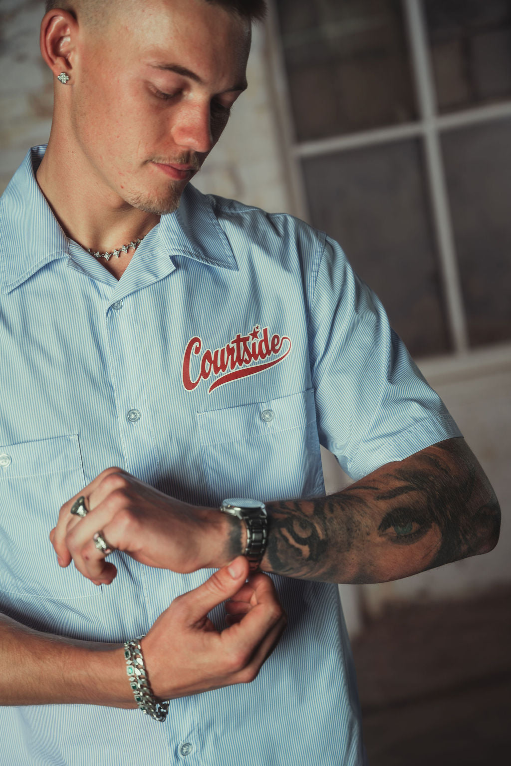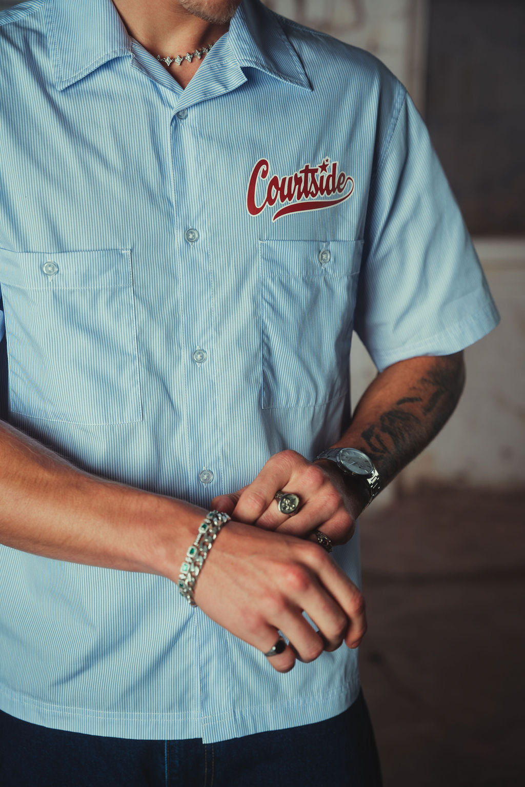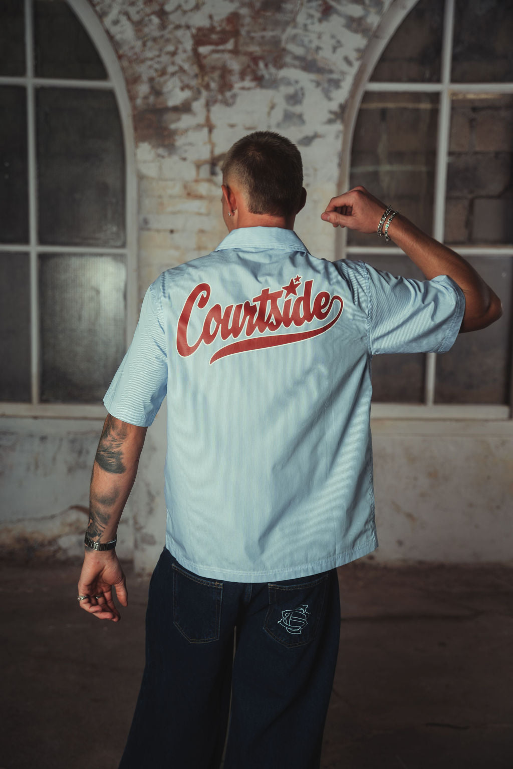 Crafted in blue and white pinstripes, it’s finished with contrasting red signature slogan to the chest and rear — a timeless piece with a bold statement twist.